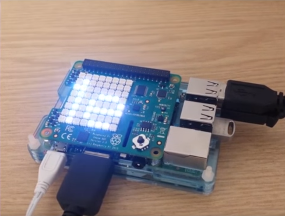 And in a Python script on the Raspberry Pi, write we some code to print a message. The message is printed on a SenseHAT, which has an LED display that can be controlled from a simple Python library.