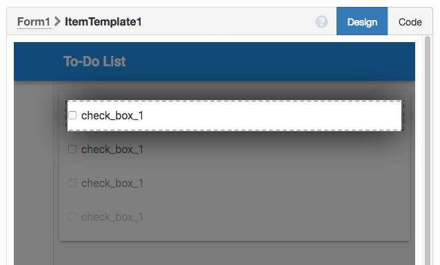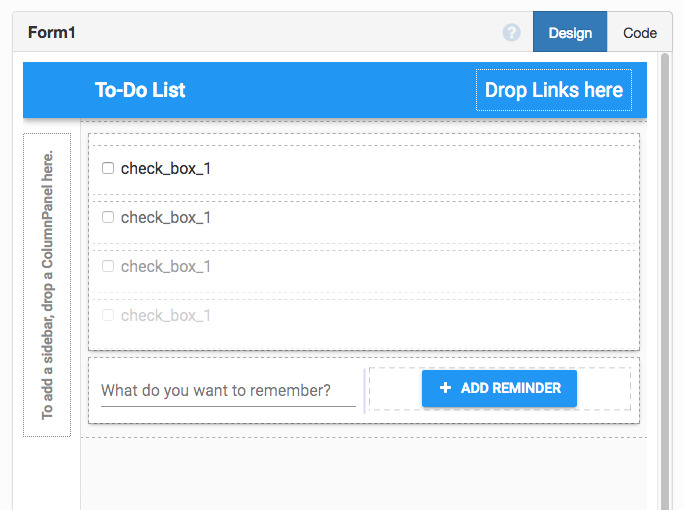 We want to display our reminders visually, so on our Form we need to create a list with one element per reminder. We do this using a RepeatingPanel. A RepeatingPanel repeats a UI template once for each item in a list.