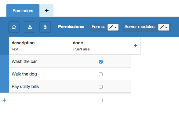 Our reminders are stored in a table with a Text column for the description, and a True/False column to mark which reminders are done.